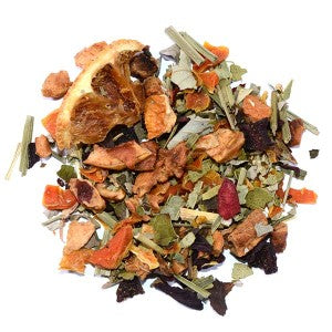 Predominantly citrus, this Pioneer Tea contains orange and tangerine pieces, blackberry and eucalyptus leaves, lemongrass, beetroot and carrot flakes, apple pieces, and hibiscus flowers.